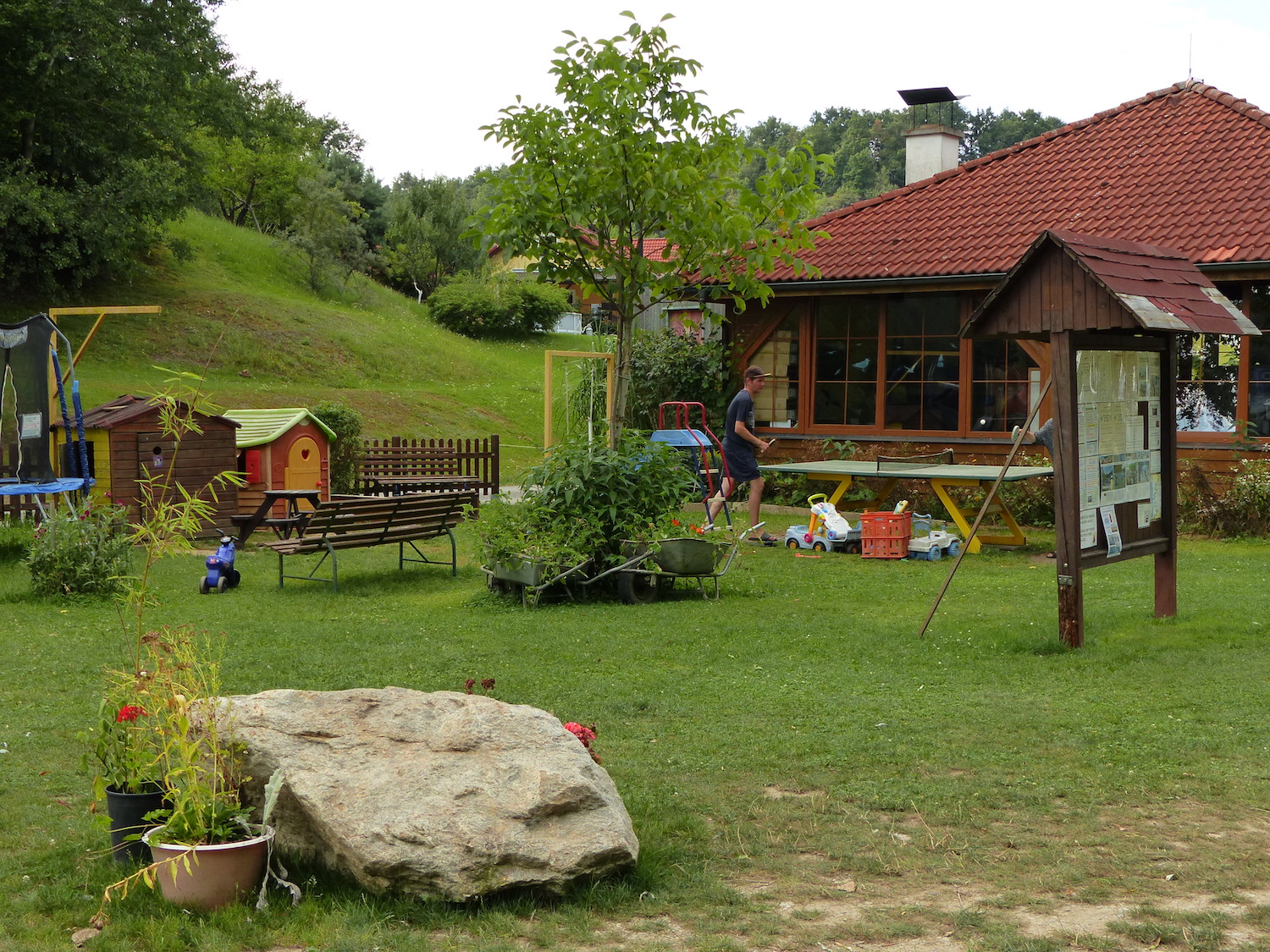Pro děti máme malé hřiště s pískovištěm, houpačkou, stolním tenisem a velkou trampolínou. Když prší, je k dispozici velký prosklený altán.